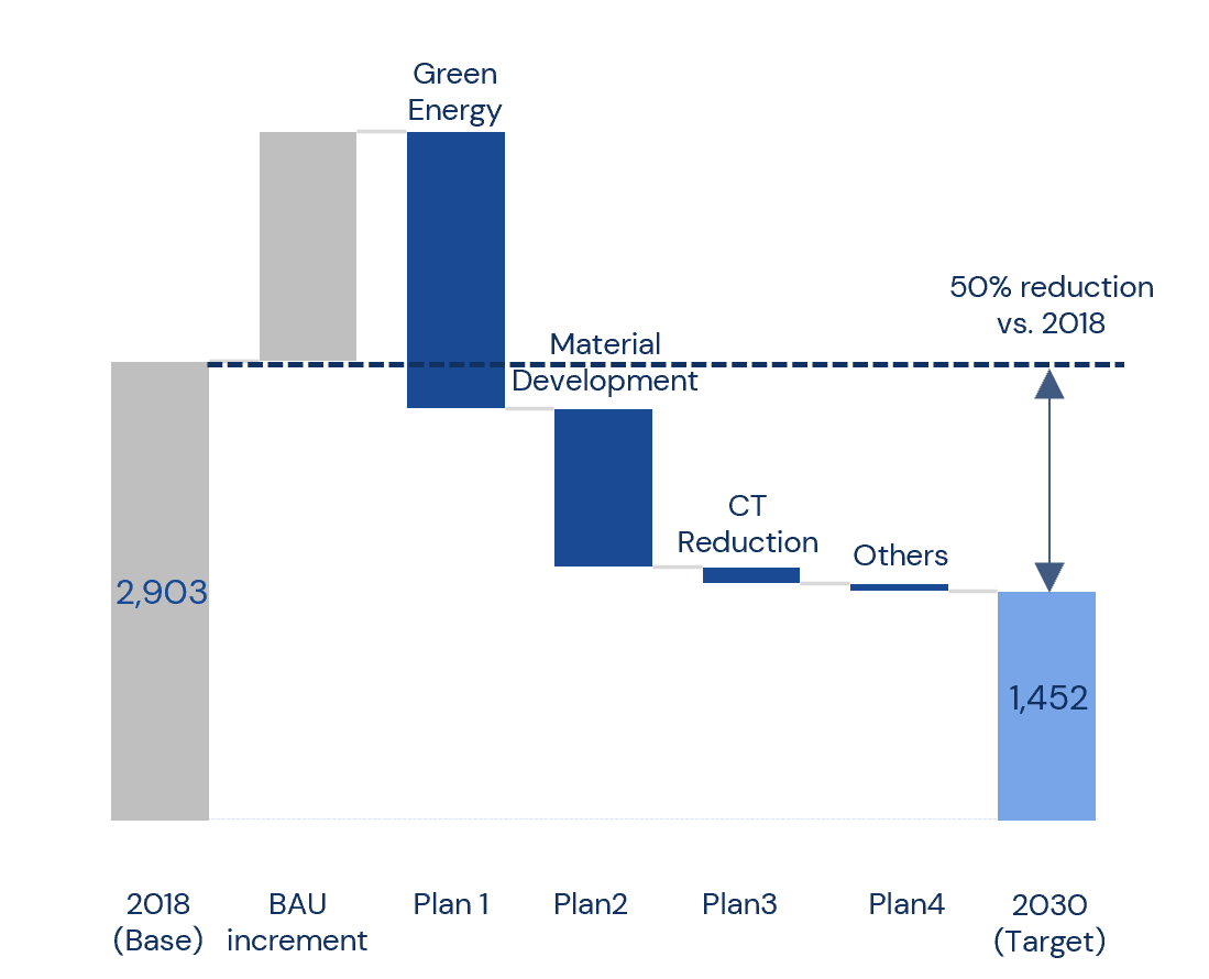 To reach this target, we aim to reduce CO₂ emission intensity by 30% by 2025 compared to 2018 levels, and by 50% for both emission intensity and total emissions by 2030.